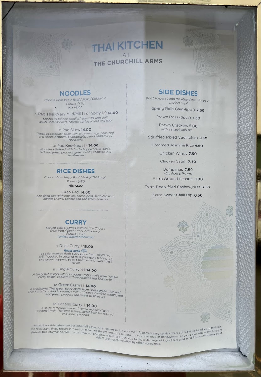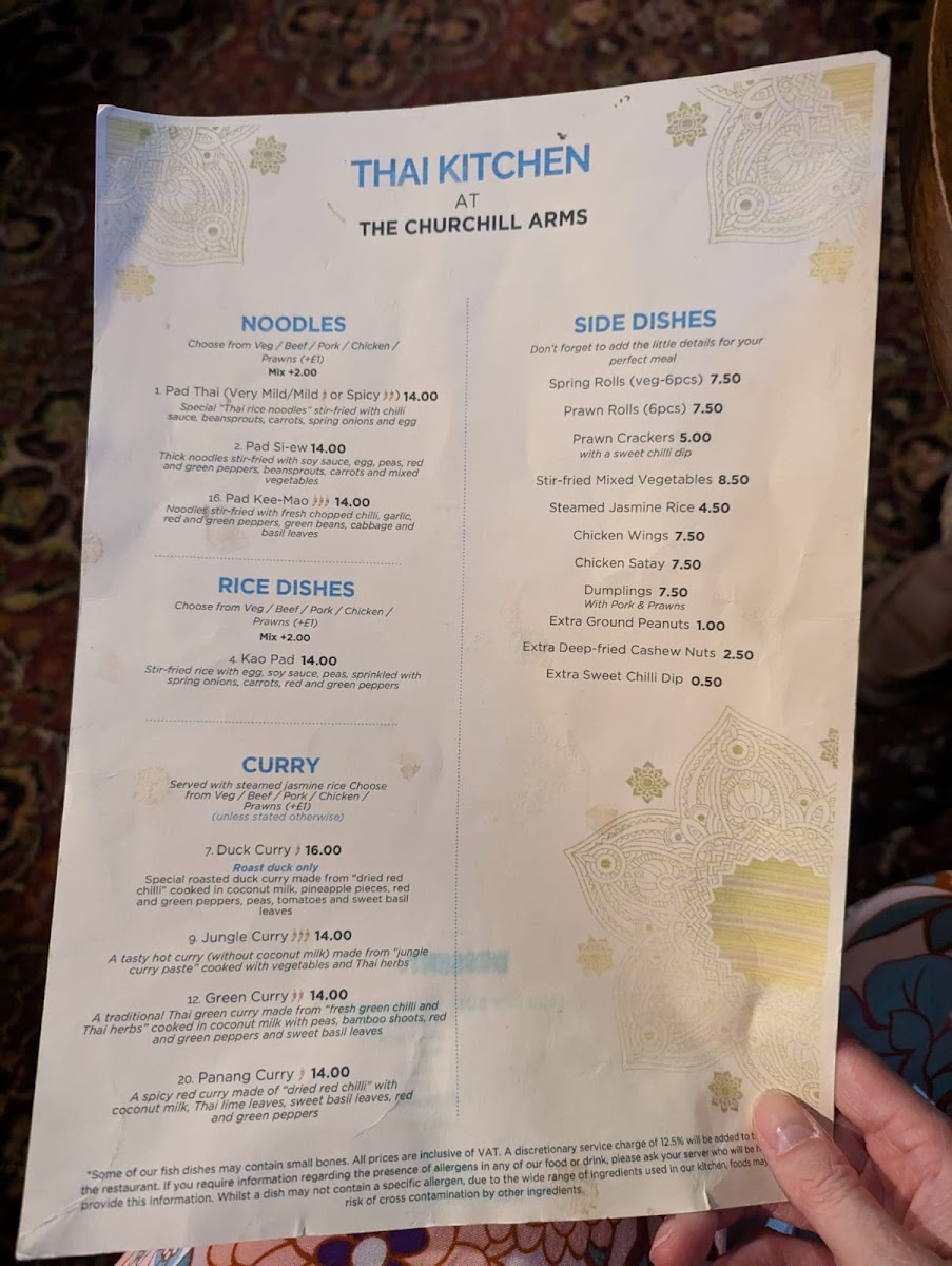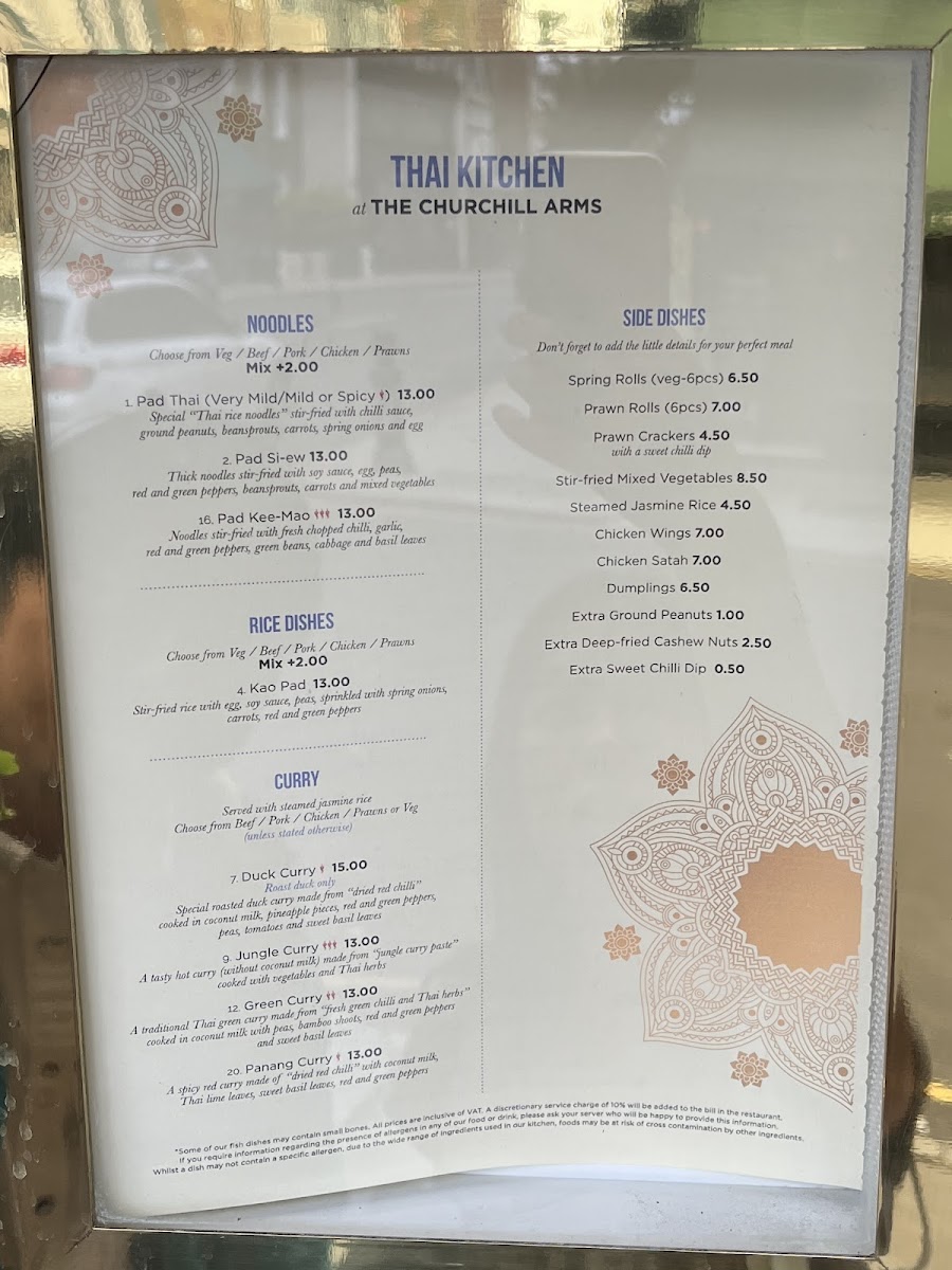 The interior is adorned with an eclectic collection of memorabilia, from British flags draping the ceiling to captivating art of Winston Churchill, offering a visual feast that enhances your experience. Whether you're attracted by the inviting aroma wafting in from the adjacent Thai kitchen or the rich history encapsulated in its walls, The Churchill Arms is more than just a drinking spot; it's a journey through time and culture.